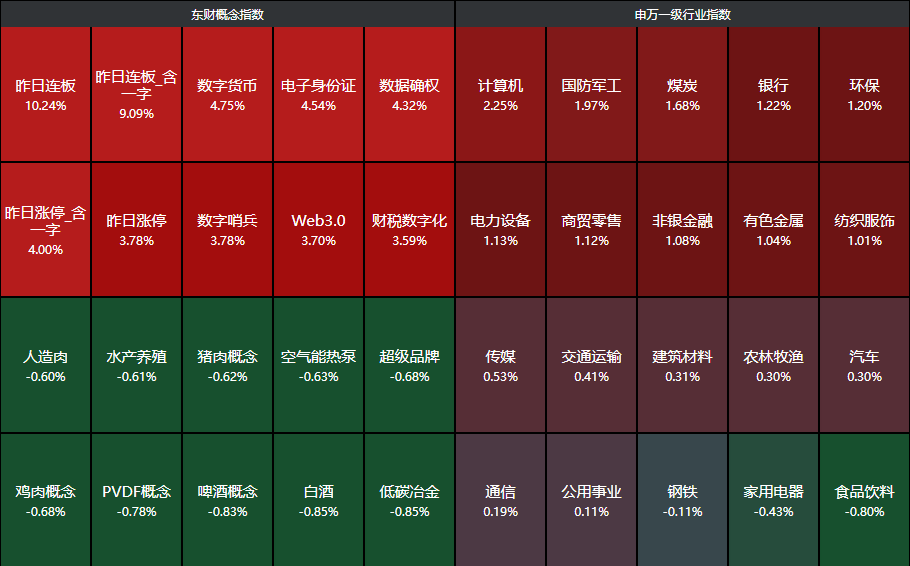 分行业来看,计算机、国防军工、煤炭、银行、环保等行业领涨,食品饮料、家用电器、钢铁三大行业下跌。